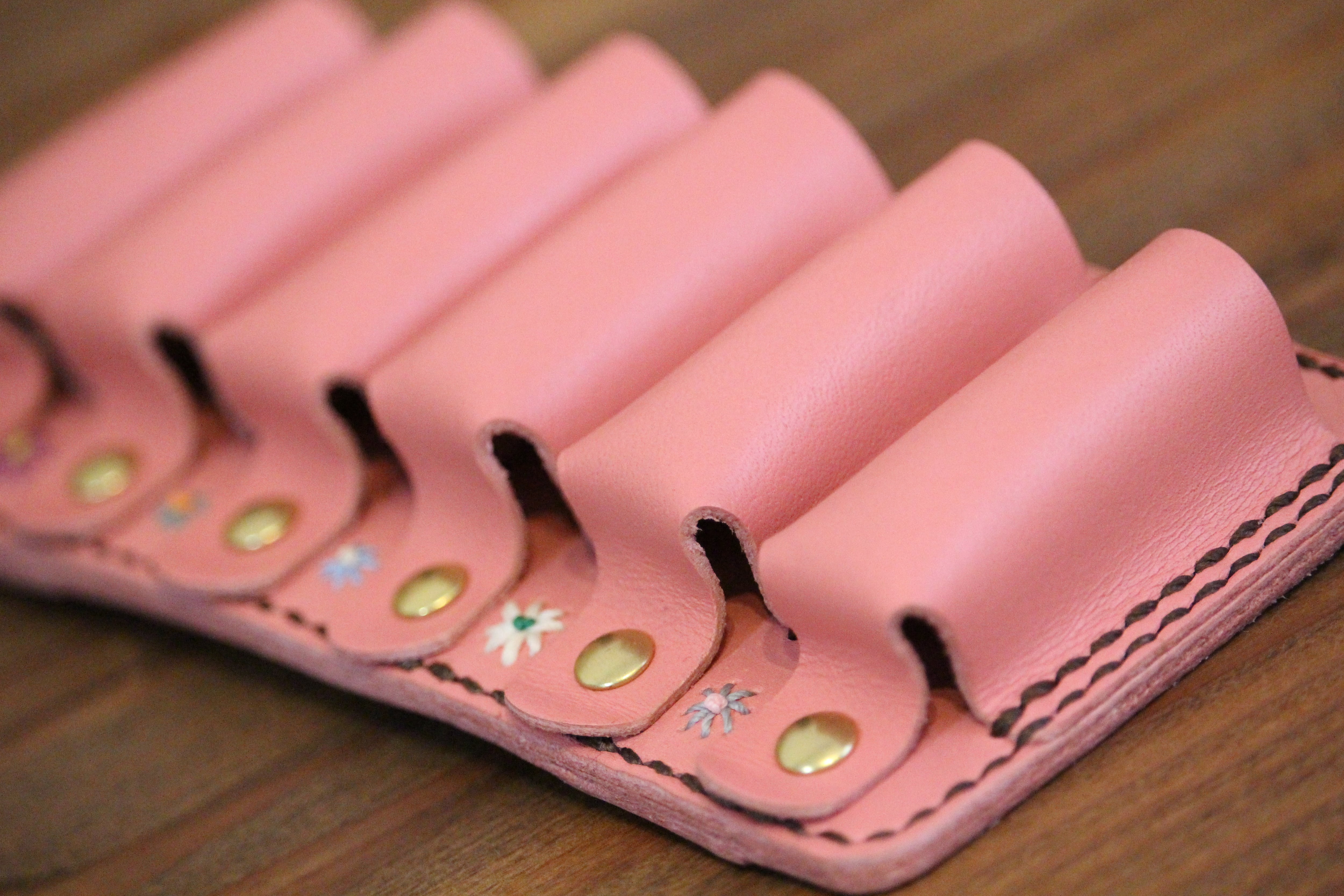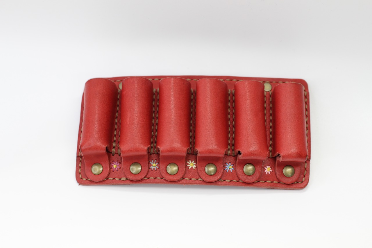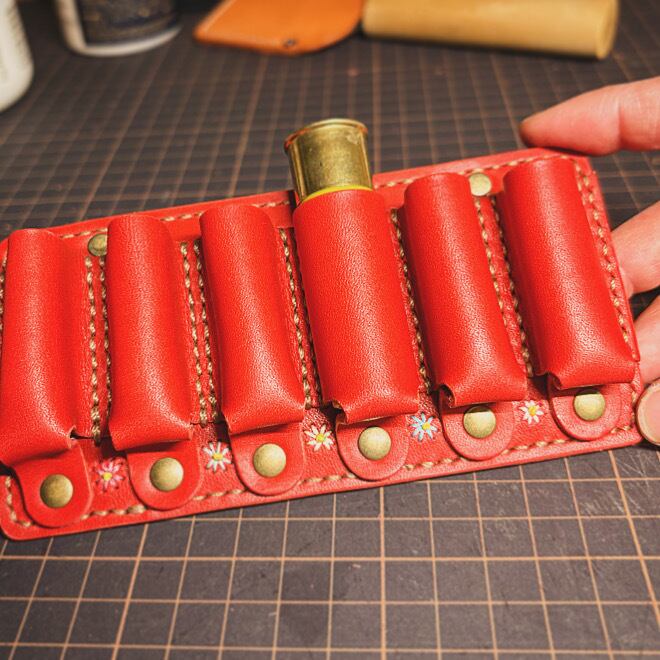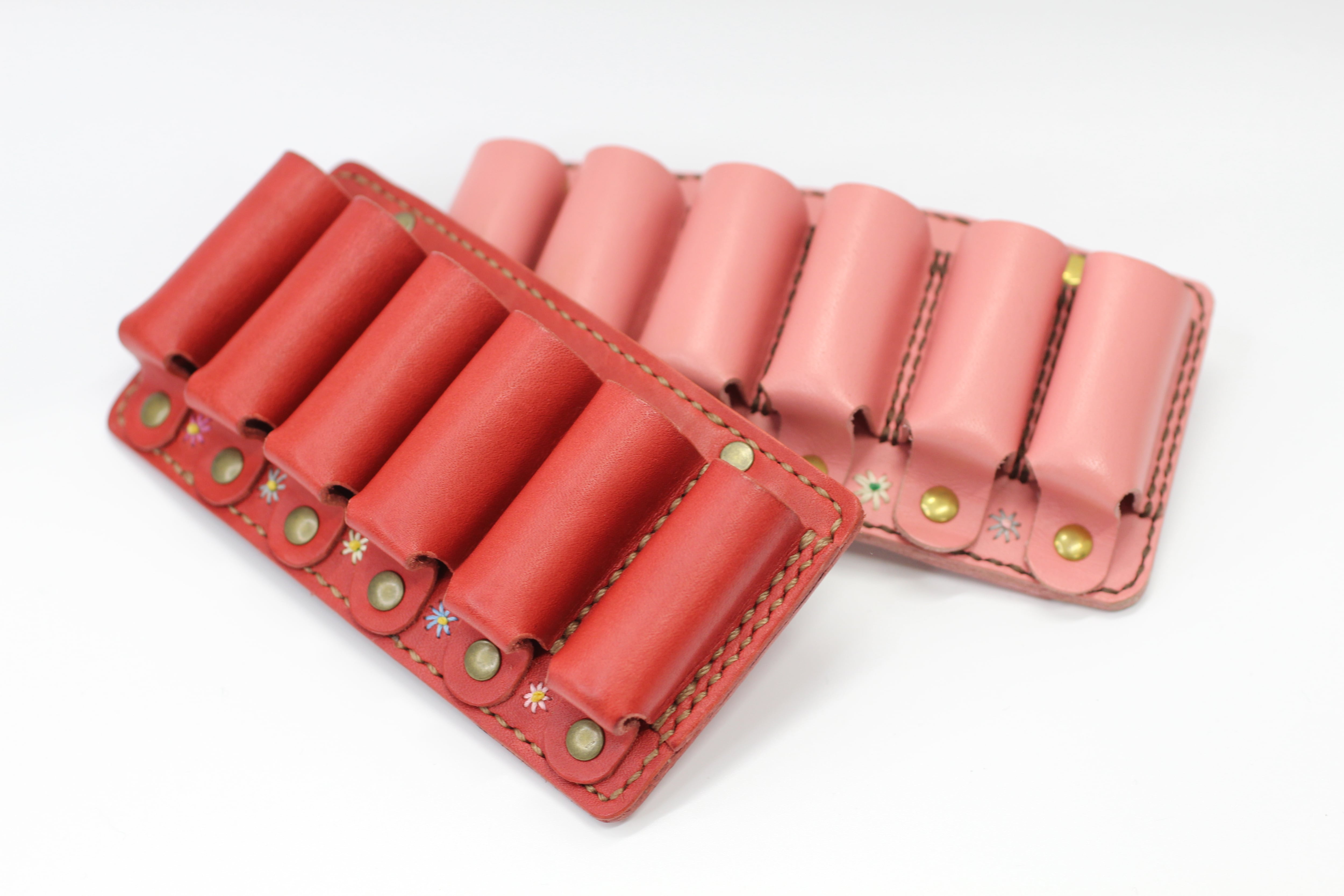 そんな小さな疑問と遊び心から生まれた、これまでの猟具の常識を覆す、最高にキュートな装弾ホルダー(弾差し)です。 ピンク、赤、水色のポップなカラーの革に、一針一針丁寧に手刺繍された花のモチーフ。