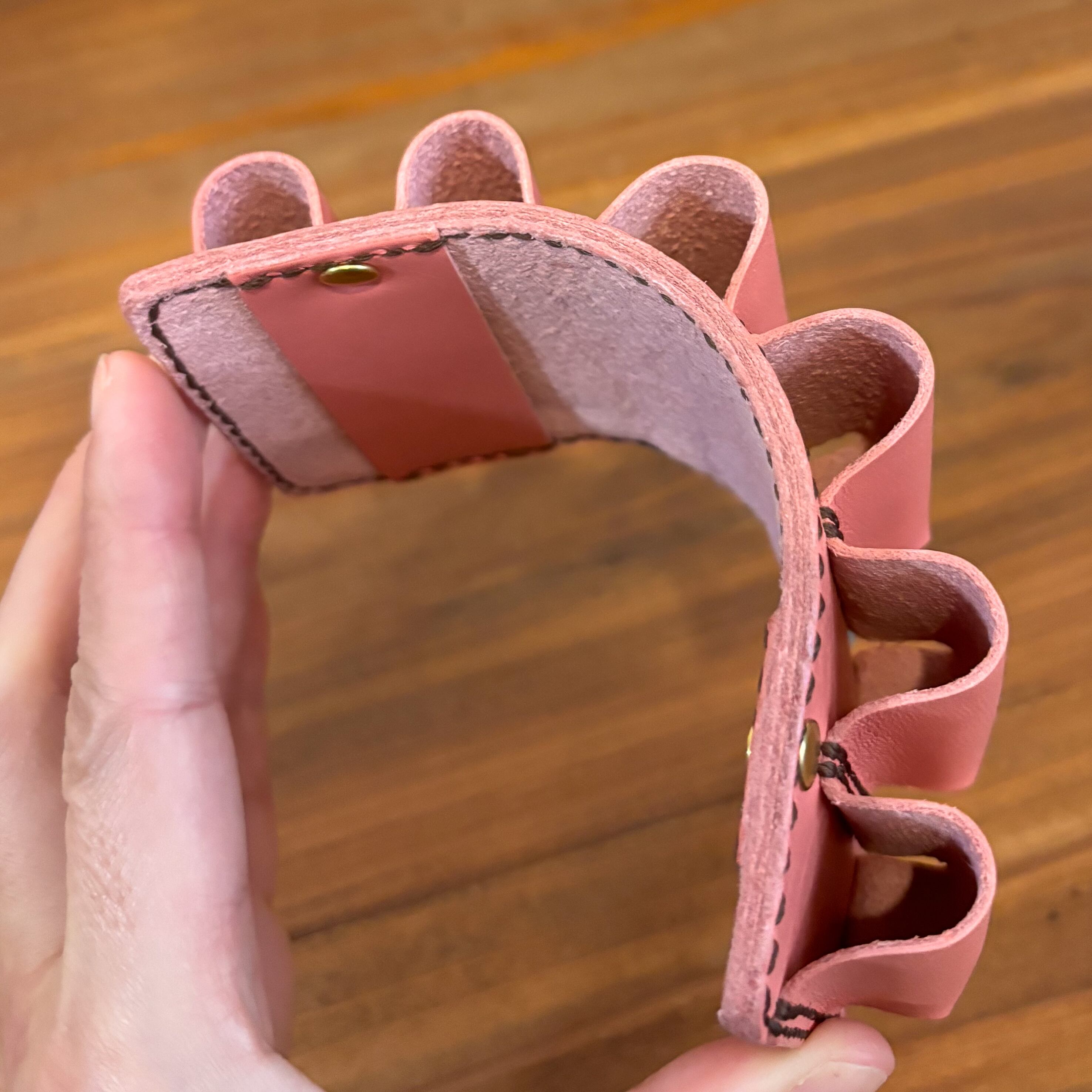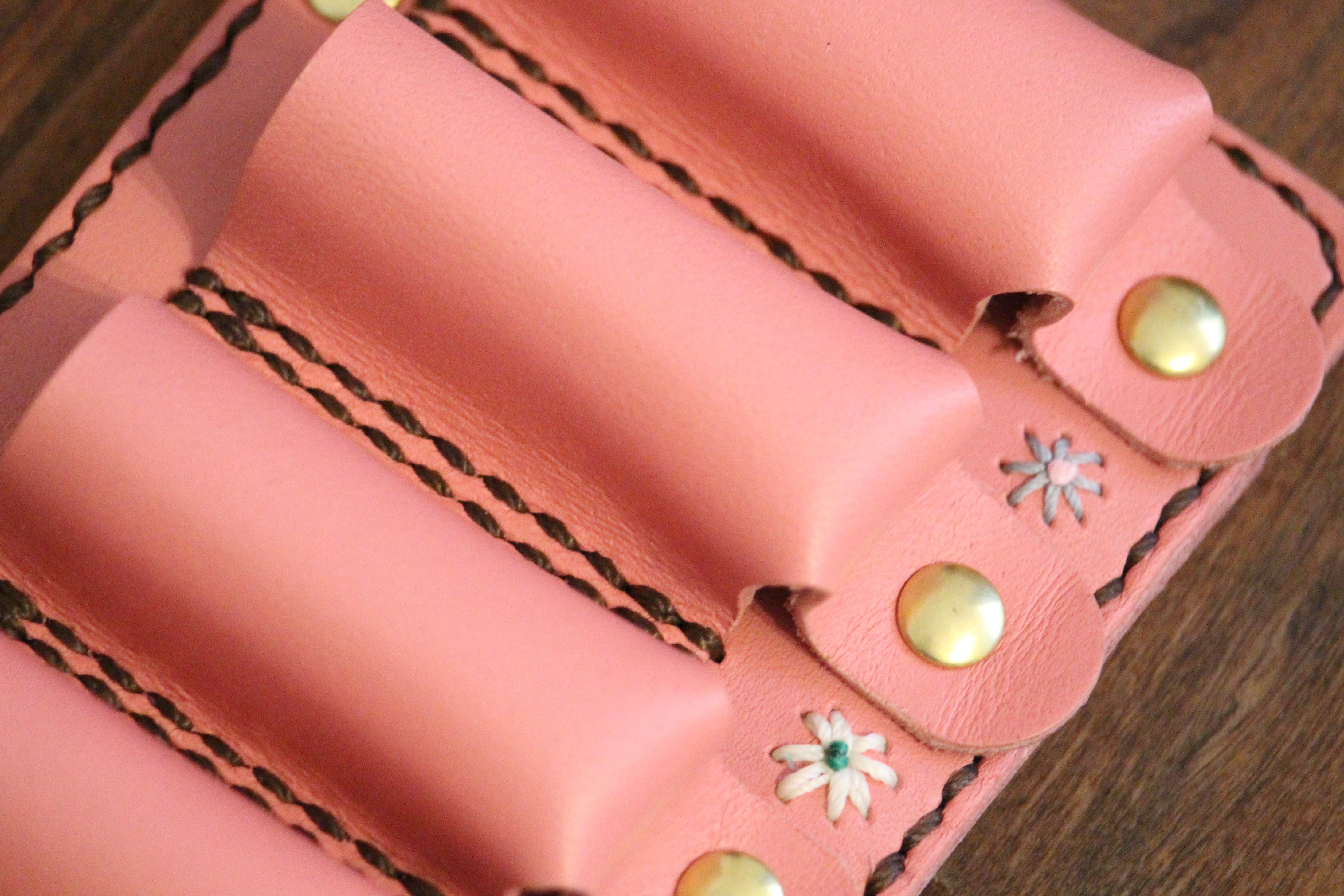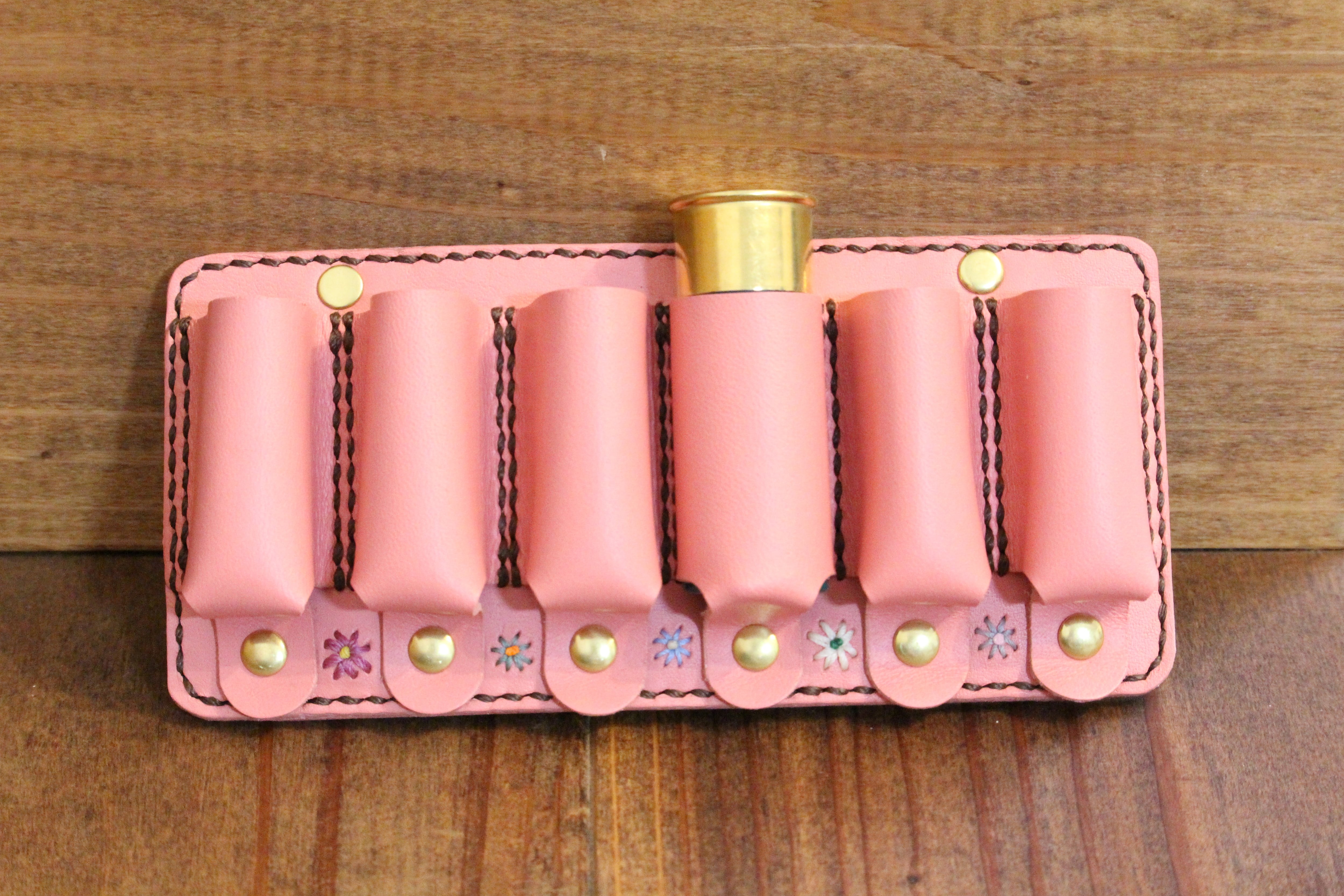 そんな小さな疑問と遊び心から生まれた、これまでの猟具の常識を覆す、最高にキュートな装弾ホルダー(弾差し)です。 ピンク、赤、水色のポップなカラーの革に、一針一針丁寧に手刺繍された花のモチーフ。